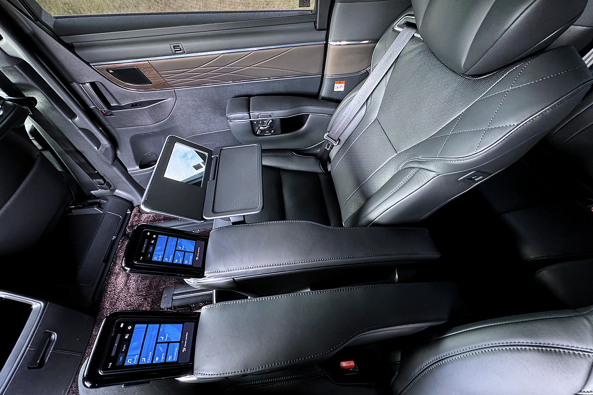 レクサス最高級本革L-ANILINEのオットマン付パワーシート、14インチリヤシートエンターテインメントシステムを装備。